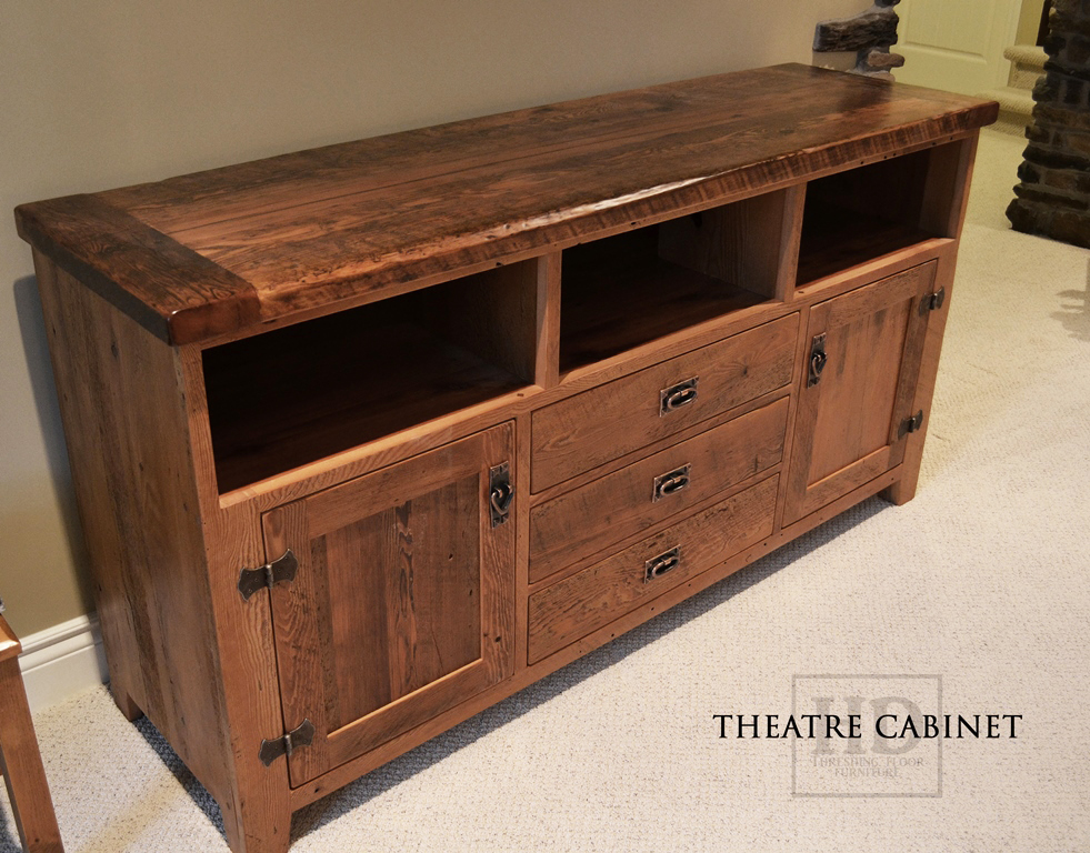 65″ Reclaimed Wood Entertainment Unit – Reclaimed Hemlock – 2″ thresh floor top – 3 drawers/ 2 doors – 3 open shelves – Premium epoxy/matte polyurethane finish