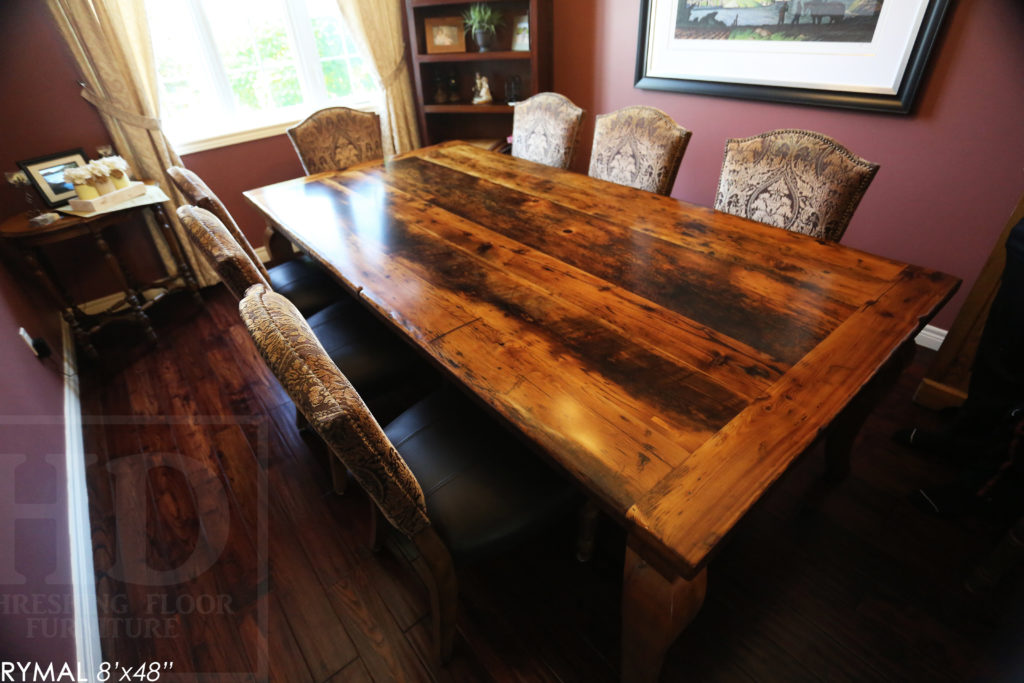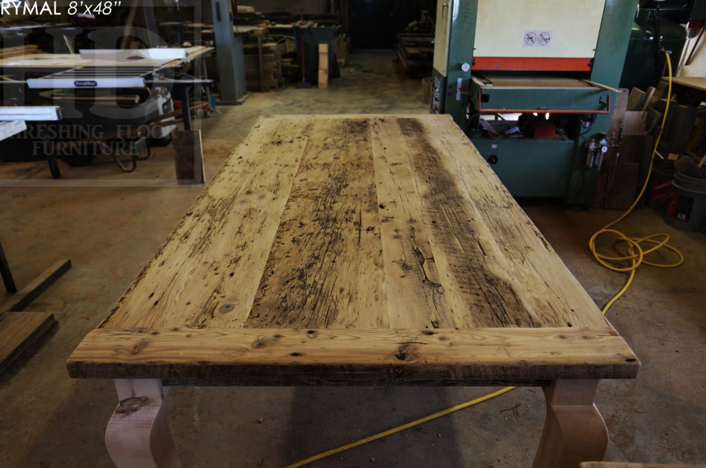 Description: 8′ Harvest Table – 48″ wide – Reclaimed Hemlock Threshing Floor Construction – Original edges/distressing kept – Cabriole Style Legs – Premium epoxy/satin polyurethane / www.hdthreshing.dreamhosters.com/blog