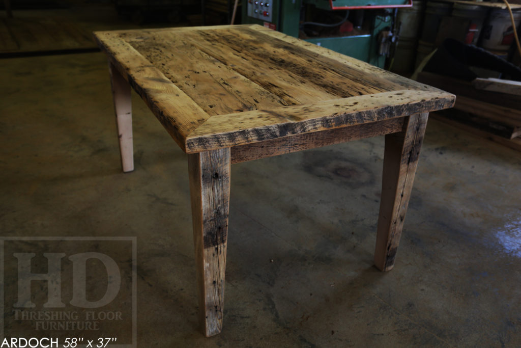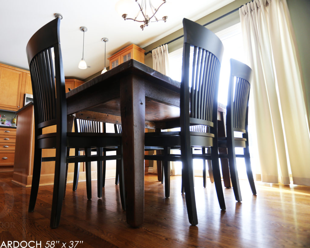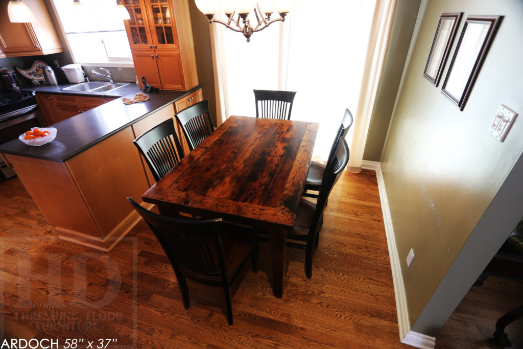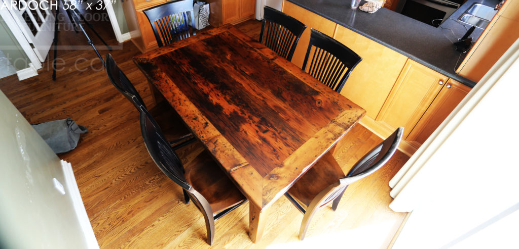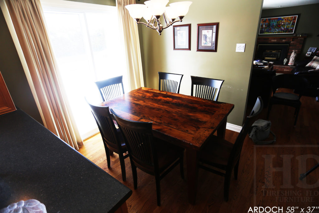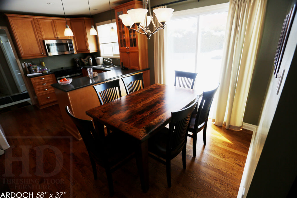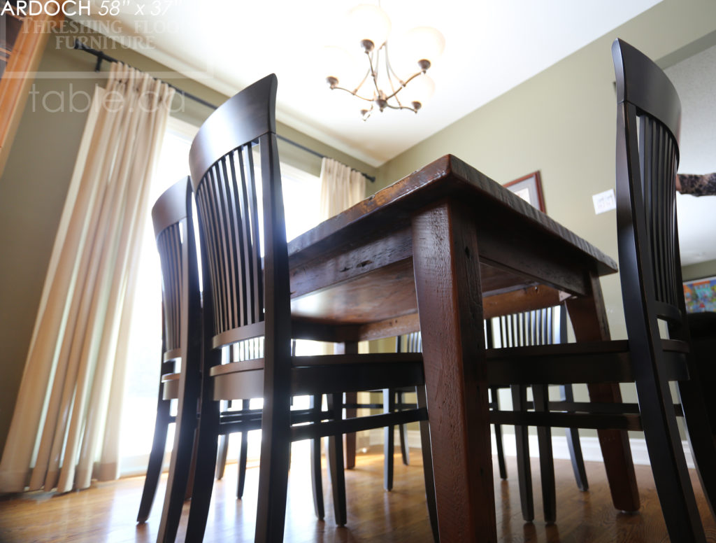 Specs: 58″ Reclaimed Wood Harvest Table for Ottawa Home – 37″ wide – Hemlock Threshing Floor 2″ Barnwood Top – Mitred Corners – Tapered with a Notch Windbrace Beam Legs – Premium epoxy/matte polyurethane finish – 6 Essex Chairs / Wormy Maple / Polyurethane clearcoat finish – www.hdthreshing.dreamhosters.com/blog