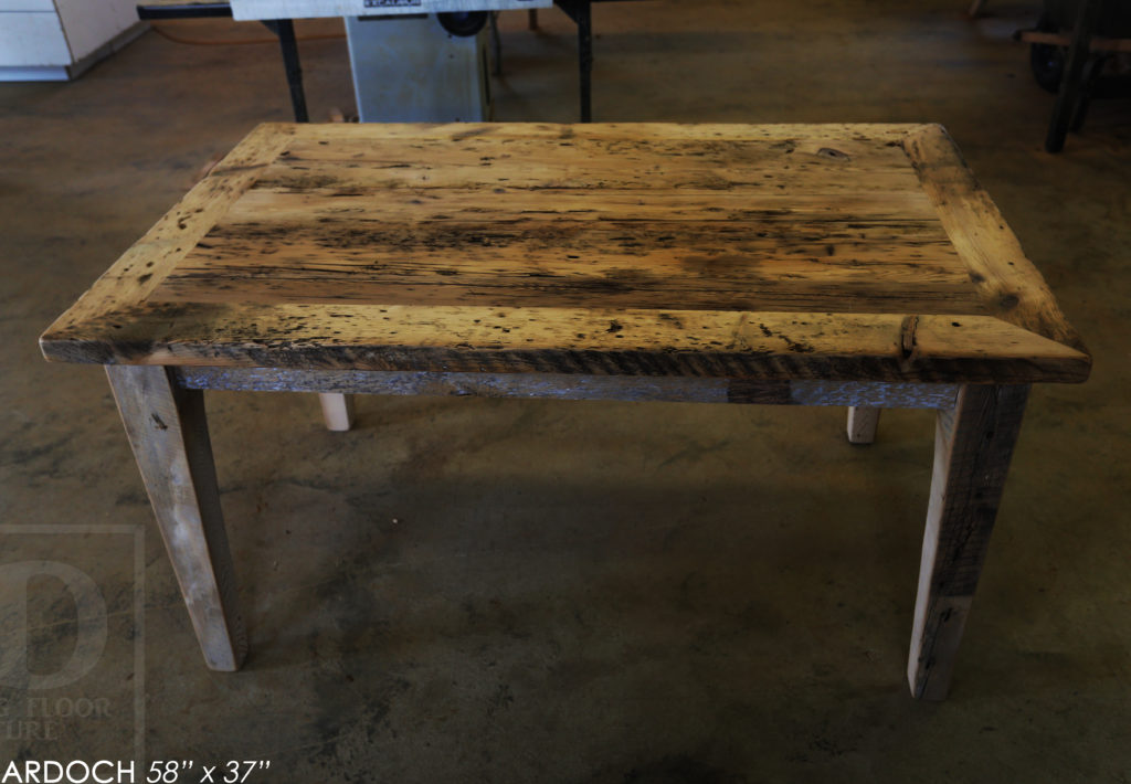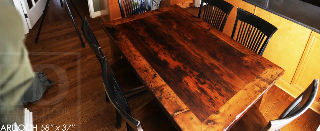 Our reclaimed wood tables can be built to ANY size. For example, if you measure our your space and an uncommon size is best, it’s no problem. Check out this atypically sized 58″x37″ harvest table we created for an Ottawa home: