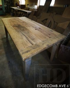 Description: 6′ x 36″ Harvest Table – Tapered with a Notch Windbrace Beam Legs – Reclaimed Hemlock Threshing Floor Construction – Premium epoxy/satin polyurethane finish – Original barnwood edges maintained – Mennonite Built