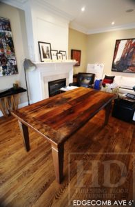 Description: 6′ x 36″ Harvest Table – Tapered with a Notch Windbrace Beam Legs – Reclaimed Hemlock Threshing Floor Construction – Premium epoxy/satin polyurethane finish – Original barnwood edges maintained – Mennonite Built