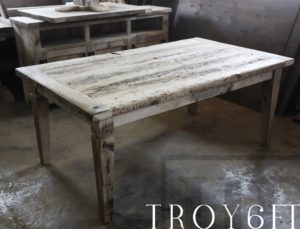 Description: 6′ Harvest Table – 42″ wide – Reclaimed Hemlock Threshing Floor Construction – Tapered with a Notch Legs – Premium epoxy/polyurethane finish – Original barn floor board edges maintained -Â 6 ft [matching] trestle style bench – 4 Strongback Chairs / Wormy Maple / Black with Sandthroughs Frame / Seat Stained Dominant Tone of Table TopÂ