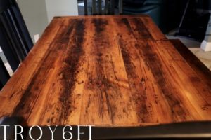 Description: 6′ Harvest Table – 42″ wide – Reclaimed Hemlock Threshing Floor Construction – Tapered with a Notch Legs – Premium epoxy/polyurethane finish – Original barn floor board edges maintained -Â 6 ft [matching] trestle style bench – 4 Strongback Chairs / Wormy Maple / Black with Sandthroughs Frame / Seat Stained Dominant Tone of Table TopÂ