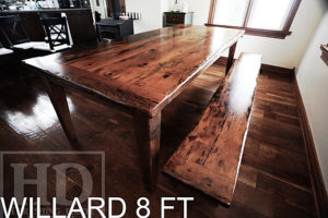 Details: 8 ft Harvest Table – 42″ wide – Premium epoxy/satin polyurethane finish – Reclaimed Barnwood Hemlock Threshing Floor 2″ top – Tapered [no notch] Windbrace Beam Legs – [Matching] 8 ft Bench