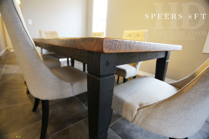 Details: 8 ft Harvest Table – 42″ wide – Premium epoxy + polyurethane topcoat finish – Tapered with a Notch Legs – Black skirting and legs – Reclaimed Hemlock Threshing Floor Barnwood Construction – original live edge barn floor board edges
