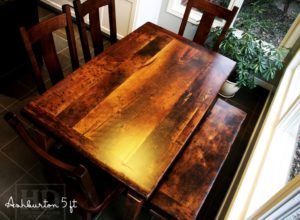 Details: 5 ft Harvest Table – 36″ wide – Tapered with a Notch Legs – Reclaimed Pine Threshing Floor Construction – Premium epoxy/matte polyurethane finish – Tapered with a Notch Legs – Matching 4.5 ft Bench – Plank Back Chairs / Wormy Maple / Polyurethane Clearcoat Finish