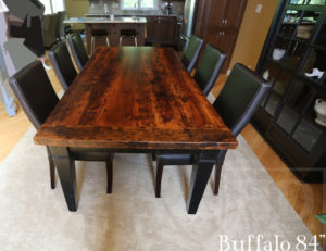 Specifications: 7 foot Hand-Made Reclaimed Wood Harvest Table – 42″ wide – Tapered with a Notch Windbrace Beam Legs – Premium epoxy/matte polyurethane finish – Black skirting & Legs – Reclaimed Hemlock Barnwood Threshing Floor Construction – Original live barn floor board edges maintained