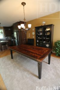 Specifications: 7 foot Hand-Made Reclaimed Wood Harvest Table – 42″ wide – Tapered with a Notch Windbrace Beam Legs – Premium epoxy/matte polyurethane finish – Black skirting & Legs – Reclaimed Hemlock Barnwood Threshing Floor Construction – Original live barn floor board edges maintained