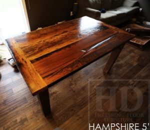 Specifications: 5 foot Harvest Table – 36 inches wide – Reclaimed Hemlock Threshing Floor Construction – Premium [light] epoxy/polyurethane finish – Original barnwood edges maintained – Straight 4″x4″ Windbrace Beam LegsÂ