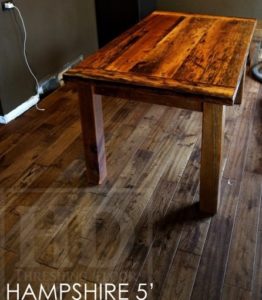 Specifications: 5 foot Harvest Table – 36 inches wide – Reclaimed Hemlock Threshing Floor Construction – Premium [light] epoxy/polyurethane finish – Original barnwood edges maintained – Straight 4″x4″ Windbrace Beam LegsÂ