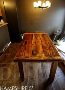 Specifications: 5 foot Harvest Table – 36 inches wide – Reclaimed Hemlock Threshing Floor Construction – Premium [light] epoxy/polyurethane finish – Original barnwood edges maintained – Straight 4″x4″ Windbrace Beam LegsÂ