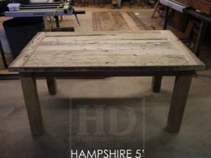 Specifications: 5 foot Harvest Table – 36 inches wide – Reclaimed Hemlock Threshing Floor Construction – Premium [light] epoxy/polyurethane finish – Original barnwood edges maintained – Straight 4″x4″ Windbrace Beam LegsÂ