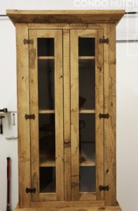 Details: Reclaimed Wood Hutch Cabinet – 8 foot Height – 36 Inches Wide – 26 Inches Deep – 2 Top Doors with Glass – 2 bottom drawers and doors – Lee Valley Hardware – 1″ Hemlock Grainery Board Construction – Internal 1′ Adjustable Shelving – Polyurethane Clearcoat Finish – Original Distressing Kept