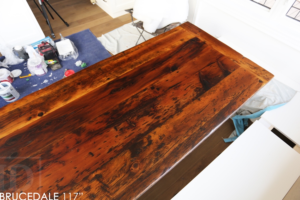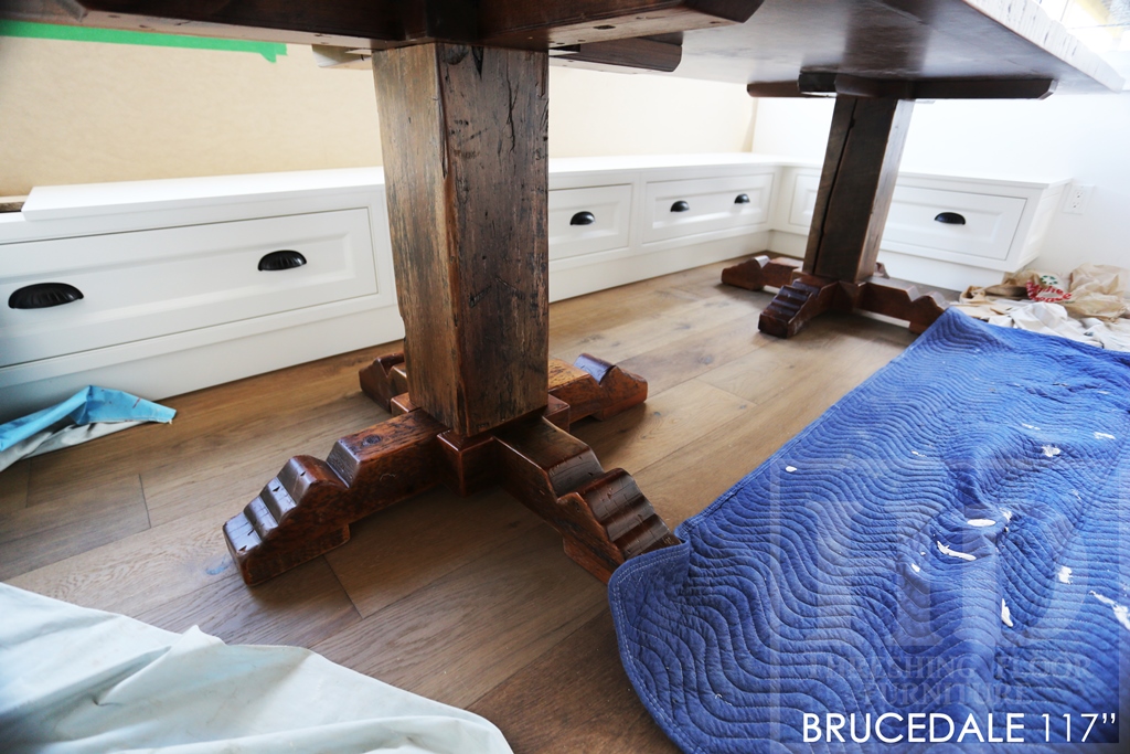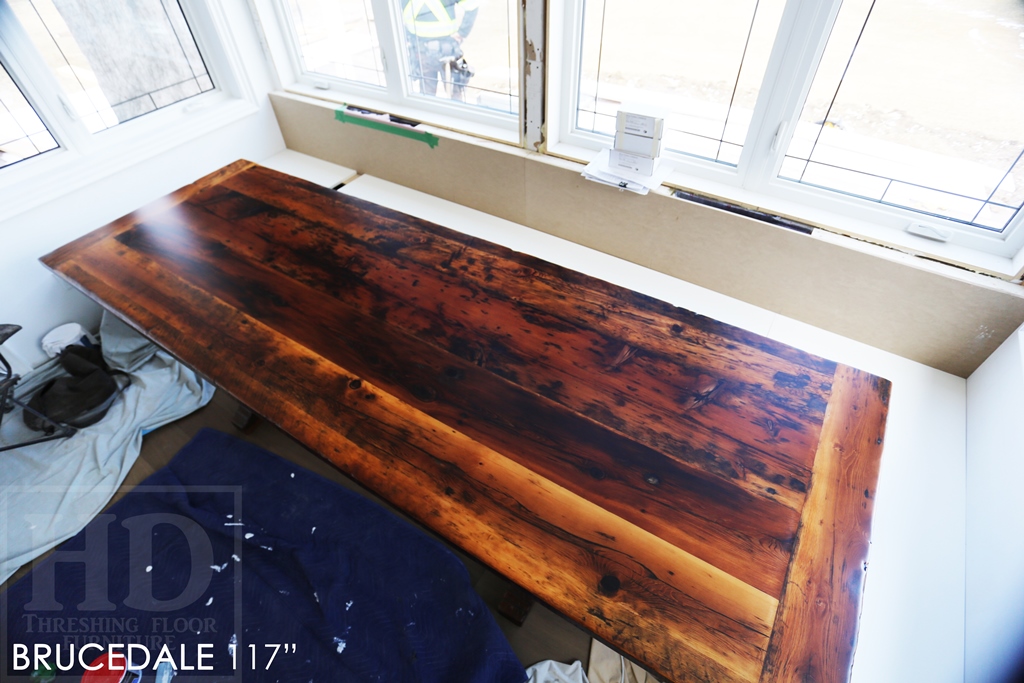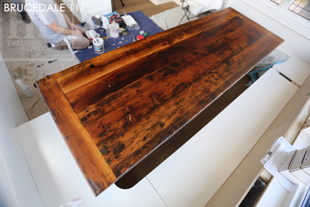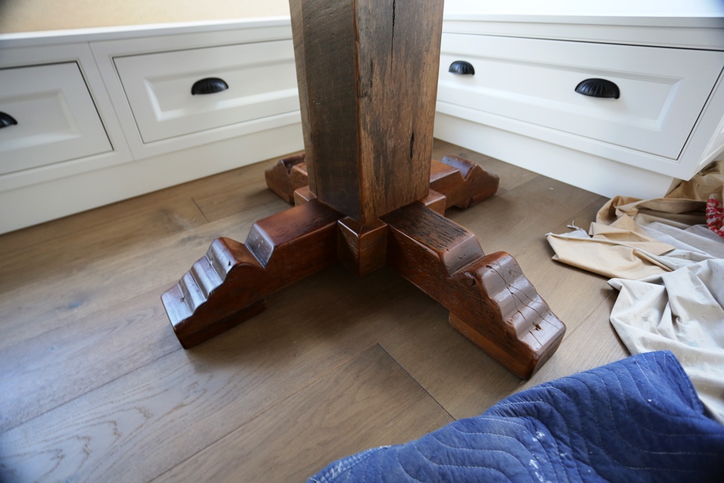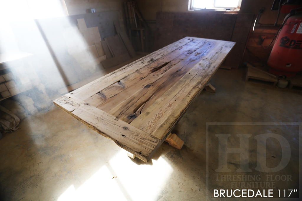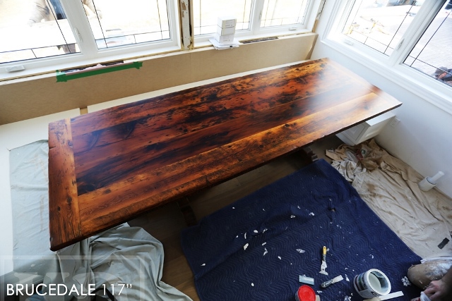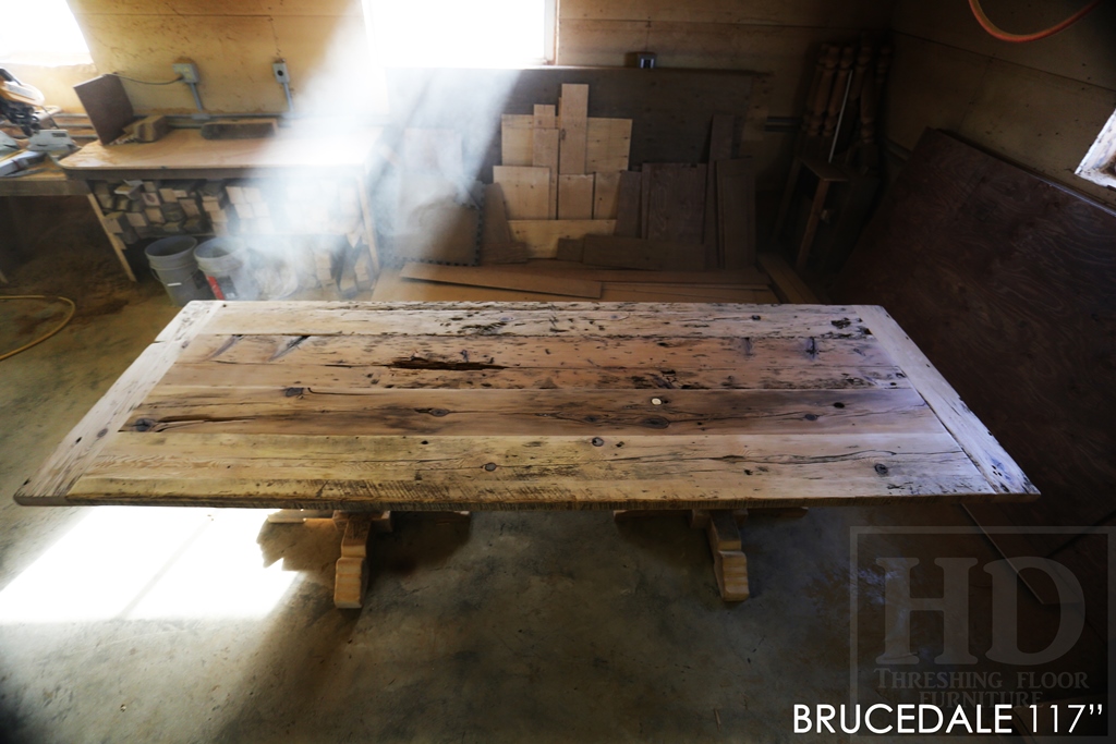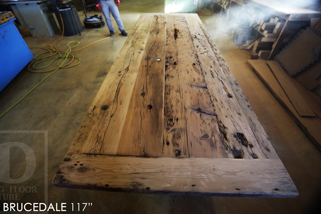 Our unique finish allows us to keep nearly all the original distressing. This means at the unfinished stage our table are very rough. We send pictures to our customer during the process; so we are able to show what our tables look like before and after finishing. Check out these before/after pics of a reclaimed wood pedestal table we made for a client in Rockwood, Ontario: