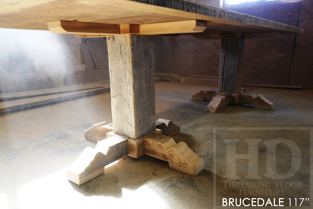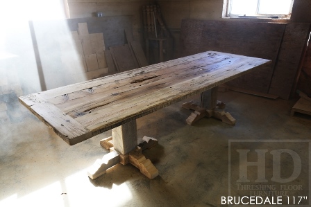 Description: 117″ Reclaimed Wood Table – 40″ wide – Beam Pedestal Posts – Curved Foot Profile – Premium epoxy + polyurethane finish – Reclaimed Hemlock Threshing Floor Construction 2″ Top – Original distressing / barn floor board edges maintainedÂ