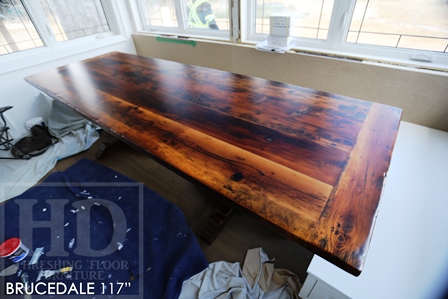 Description: 117″ Reclaimed Wood Table – 40″ wide – Beam Pedestal Posts – Curved Foot Profile – Premium epoxy + polyurethane finish – Reclaimed Hemlock Threshing Floor Construction 2″ Top – Original distressing / barn floor board edges maintained