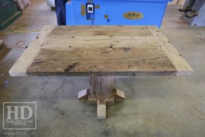 Ontario Reclaimed Wood Pedestal Tables by HD Threshing Floor Furniture – Hand-Hewn Beam Pedestals Recovered from Pioneer Barn Timber Frames – Tops Reclaimed from Old Threshing Floors [Barn Floor Board]Â
