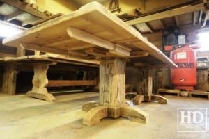 Ontario Reclaimed Wood Pedestal Tables by HD Threshing Floor Furniture – Hand-Hewn Beam Pedestals Recovered from Pioneer Barn Timber Frames – Tops Reclaimed from Old Threshing Floors [Barn Floor Board]Â