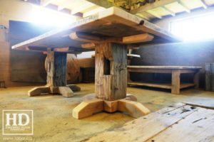 Ontario Reclaimed Wood Pedestal Tables by HD Threshing Floor Furniture – Hand-Hewn Beam Pedestals Recovered from Pioneer Barn Timber Frames – Tops Reclaimed from Old Threshing Floors [Barn Floor Board]Â
