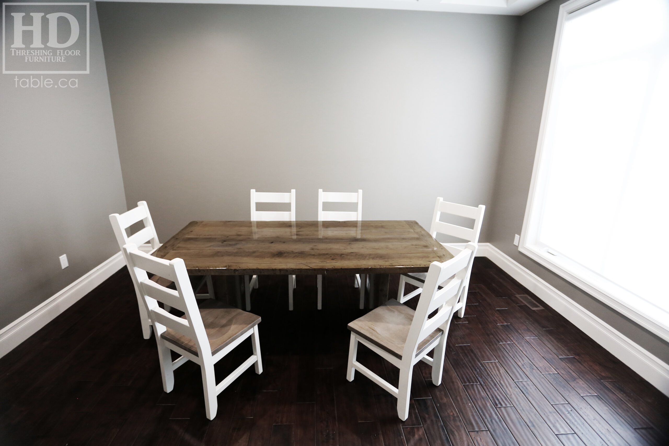 Reclaimed Wood Table with High Gloss Finish Option in Barnboard Grey Option with Wormy Maple Ladder Back Chairs