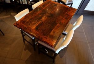 Details: Reclaimed Wood Restaurant Table Top – Premium epoxy/satin polyurethane finish – Hemlock Threshing Floor 2″ thick Construction – Barn Floor Board Distressing MaintainedÂÂ
