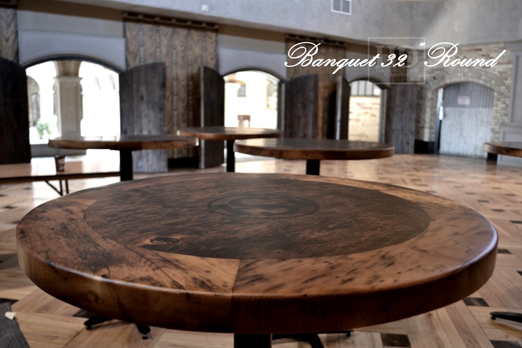 Details: 32″ Restaurant Round Tops – Reclaimed Threshing Floor Pine – 2″ thick threshing floor – circular bread-edging – Premium epoxy/matte polyurethane finish – By Gerald Reinink