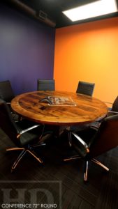 Details: 72″ Round Reclaimed Wood Boardroom/ Conference Room Table – Hand-Hewn Beam Style Base – Reclaimed Hemlock Threshing Floor 2″ Top – Premium epoxy/polyurethane finish – Custom cut steel logo embedded in table topÂ