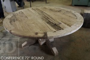 Details: 72″ Round Reclaimed Wood Boardroom/ Conference Room Table – Hand-Hewn Beam Style Base – Reclaimed Hemlock Threshing Floor 2″ Top – Premium epoxy/polyurethane finish – Custom cut steel logo embedded in table topÂ