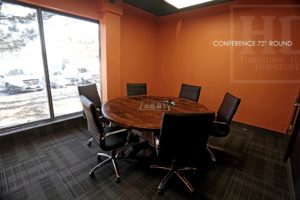 Details: 72″ Round Reclaimed Wood Boardroom/ Conference Room Table – Hand-Hewn Beam Style Base – Reclaimed Hemlock Threshing Floor 2″ Top – Premium epoxy/polyurethane finish – Custom cut steel logo embedded in table topÂ