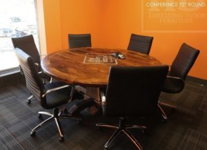 Details: 72″ Round Reclaimed Wood Boardroom/ Conference Room Table – Hand-Hewn Beam Style Base – Reclaimed Hemlock Threshing Floor 2″ Top – Premium epoxy/polyurethane finish – Custom cut steel logo embedded in table topÂ