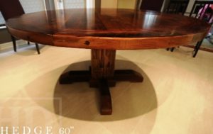 Description: 60″ Rustic Round Reclaimed Wood Pedestal Table – Cedar Hydro Pole Beam Base – Reclaimed Hemlock Threshing Floor Construction – Premium epoxy/satin polyurethane finishÂÂ
