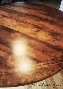 Details of table: 72″ Round Pedestal Dining Table – Reclaimed Cedar Hydro Pole Base – Reclaimed Hemlock Threshing Floor 2″ top – Premium epoxy/matte polyurethane finish Gerald Reinink