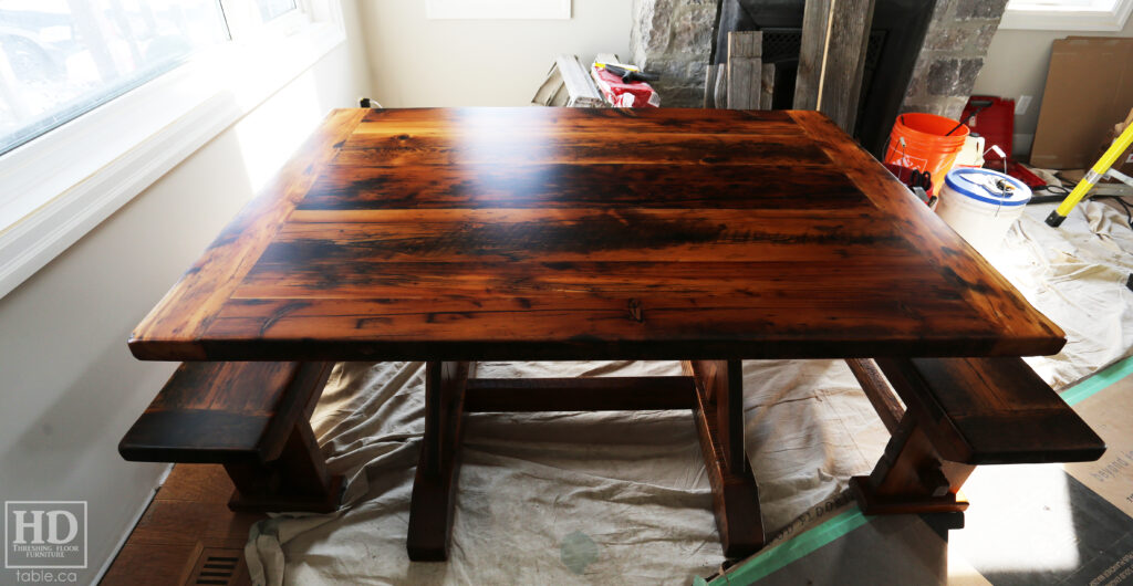 All our tables are made from 150+ year old wood reclaimed from historic Ontario barns. You can see this history & patina in the wood. Here’s a recent sawbuck table we made with antique hemlock: