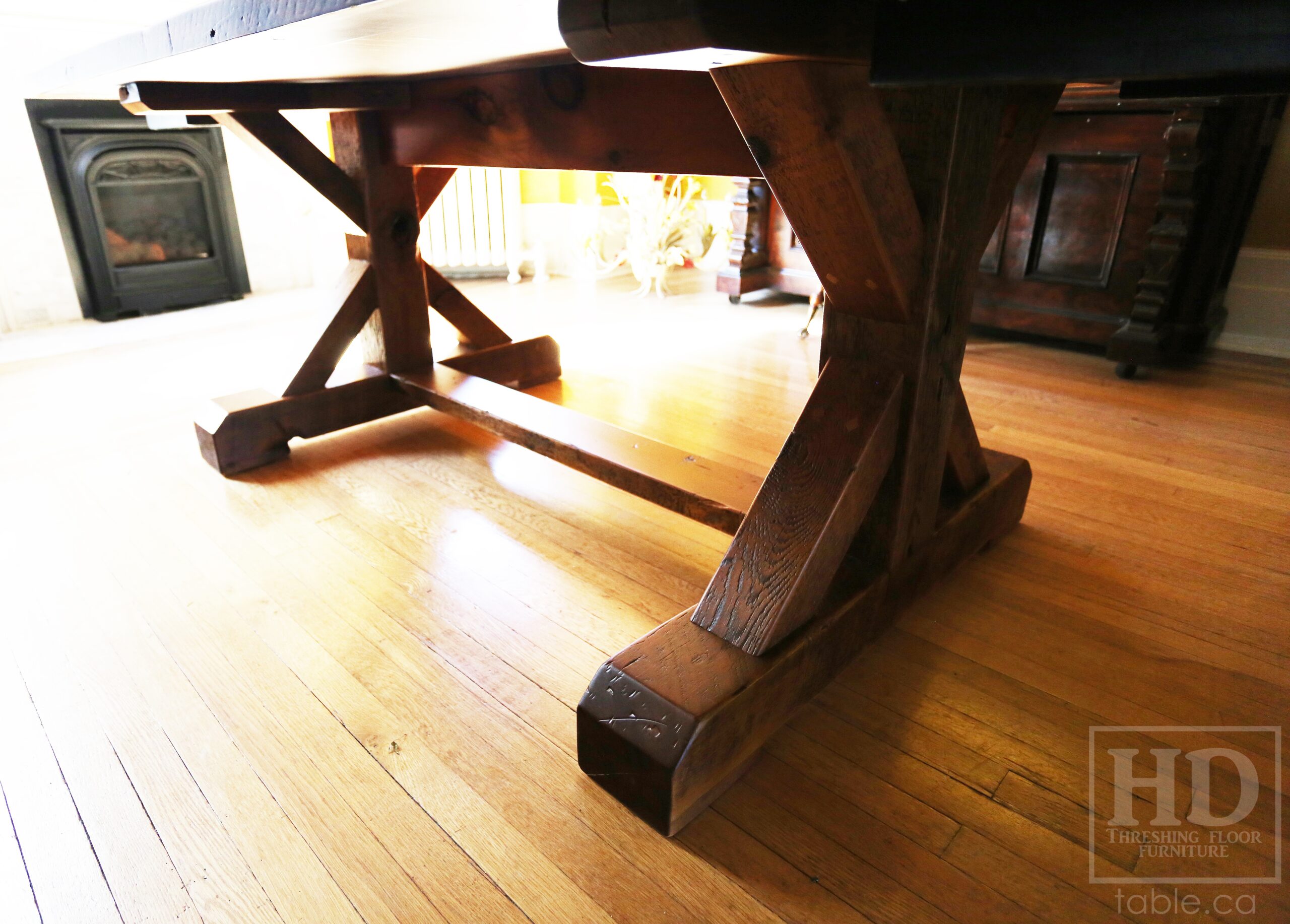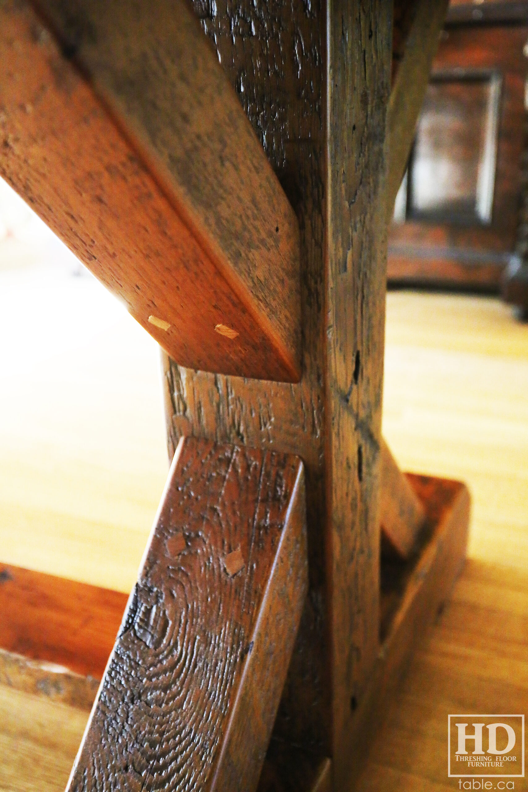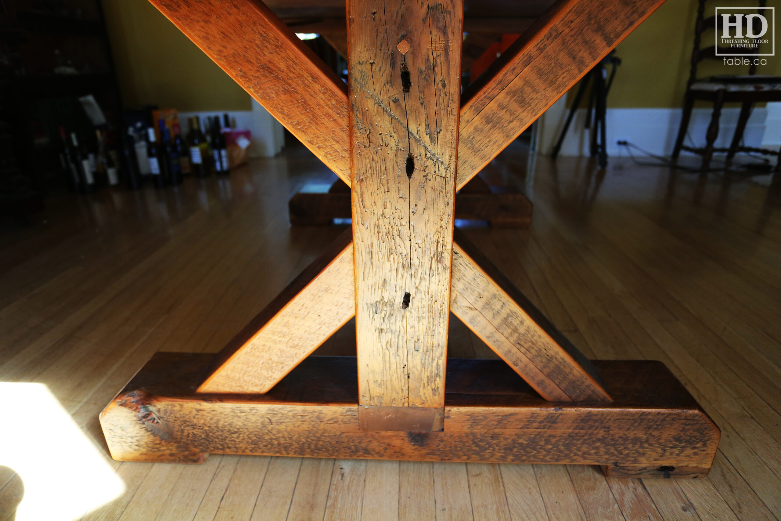 Since we build from scratch, we can do almost any modifications to your table. A popular alternative to the threshing floor sawbuck post option is using beams. See pics below from a previous project!