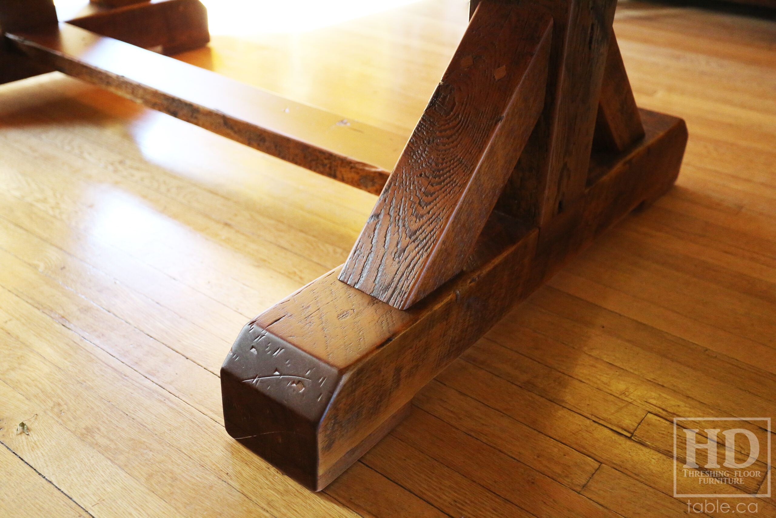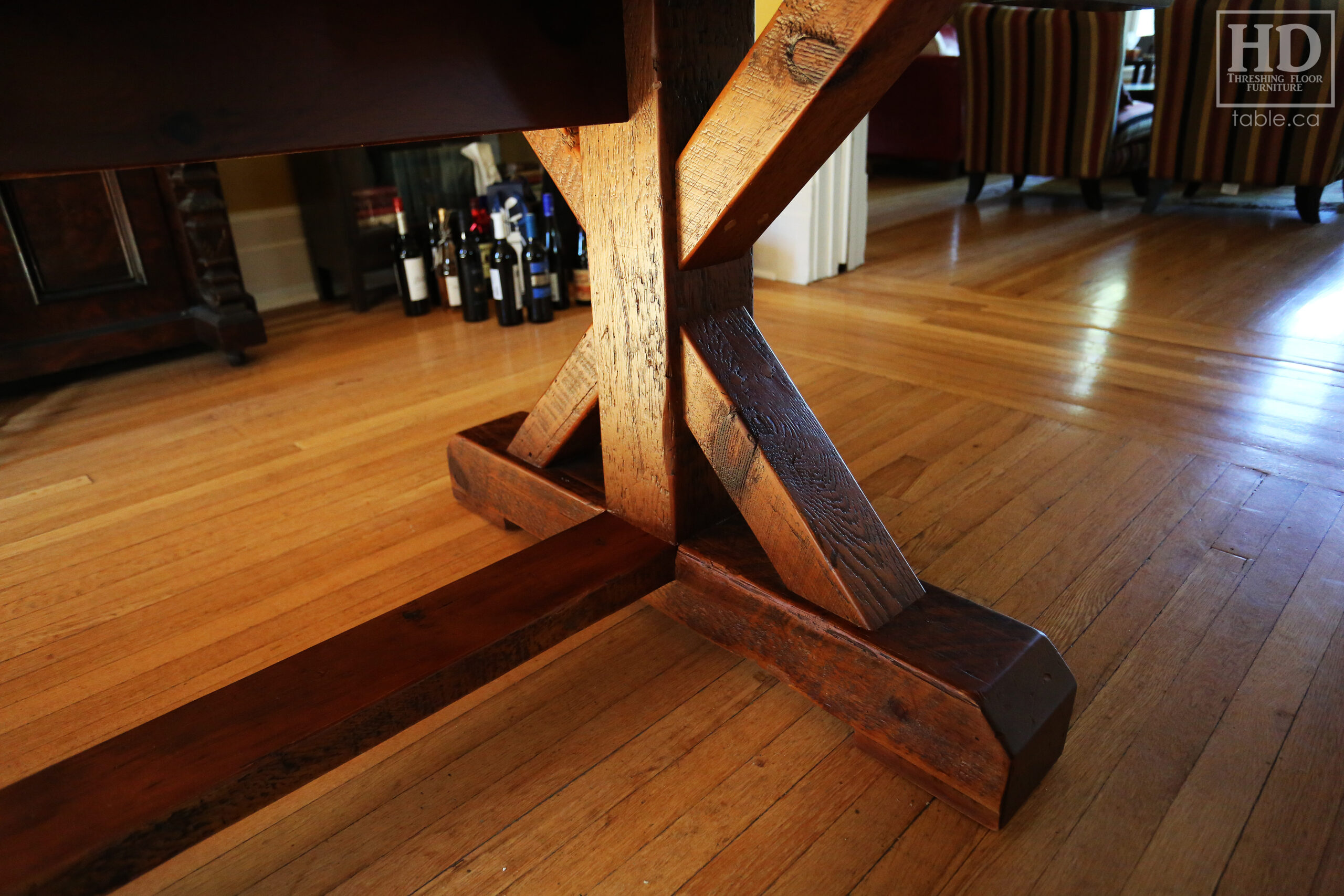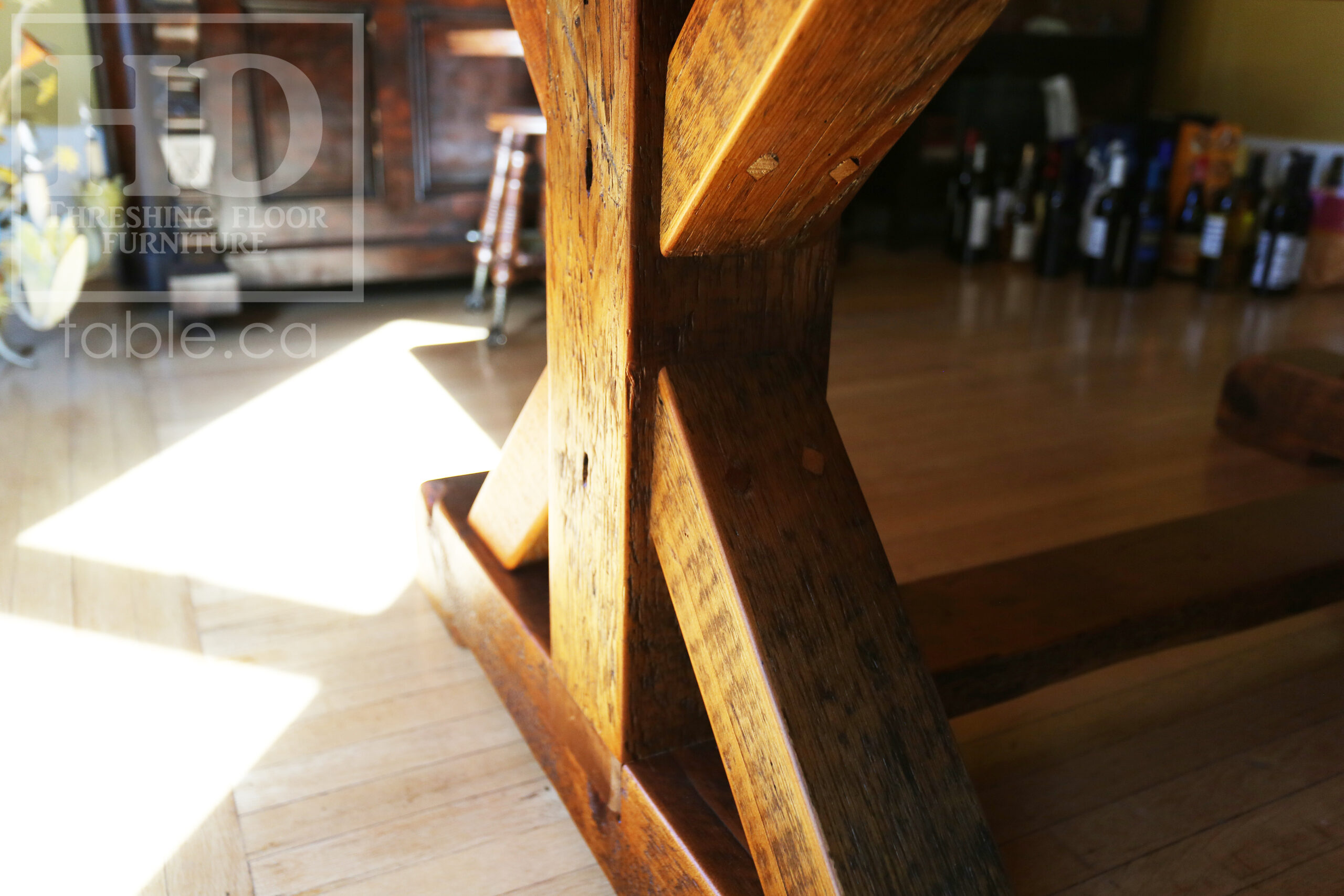 Since we build from scratch, we can do almost any modifications to your table. A popular alternative to the threshing floor sawbuck post option is using beams. See pics below from a previous project!