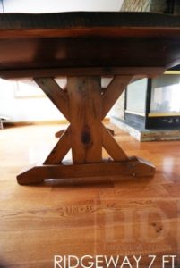 Description: 7 ft Sawbuck Table – 42″ wide – Reclaimed Hemlock Barnwood Threshing Floor – Epoxy/polyurethane finish – Original barnwood distressing/edges maintainedÂÂ
