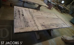 Description: 5 ft Reclaimed Wood Table – 38″ wide – Premium epoxy & satin polyurethane finish – Reclaimed Hemlock Threshing Floor Construction – 2″ Top – Original barnwood distressing maintained – Two 18″ Leaf Extensions = 5 ft [matching] Trestle Style Bench