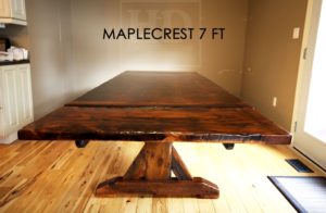Details: 7 ft Sawbuck Table -42 inches – Reclaimed Hemlock Threshing Floor Construction – Premium epoxy/polyurethane finish – Two 18″ leaf extensions – Original barnwood floor board edges