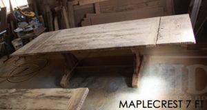 Details: 7 ft Sawbuck Table -42 inches – Reclaimed Hemlock Threshing Floor Construction – Premium epoxy/polyurethane finish – Two 18″ leaf extensions – Original barnwood floor board edges