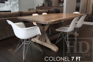 Description: 7 ft Reclaimed Wood Table – Sawbuck Style Base – Reclaimed Hemlock Threshing Floor Construction – Greytone Treatment to Preserve Colour of Unfinished – Premium epoxy/matte polyurethane finish – Original Barnwood Edges MaintainedÂÂ