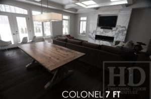 Description: 7 ft Reclaimed Wood Table – Sawbuck Style Base – Reclaimed Hemlock Threshing Floor Construction – Greytone Treatment to Preserve Colour of Unfinished – Premium epoxy/matte polyurethane finish – Original Barnwood Edges MaintainedÂÂ