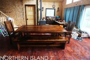 Details: 7 ft Reclaimed Barnwood Table – 3″ joist plank style base – 42″ wide – Reclaimed Hemlock Threshing Floor Construction – Premium epoxy/polyurethane finish – Two 18″ Leaf Extensions – Two [matching] 7 ft Benches – Original Rustic Distressing Maintained – 2 Rustic Pillar Arm Chairs / Wormy MapleÂ