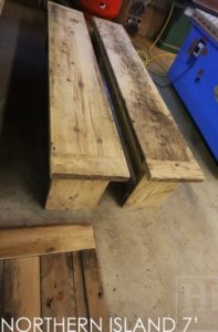 Details: 7 ft Reclaimed Barnwood Table – 3″ joist plank style base – 42″ wide – Reclaimed Hemlock Threshing Floor Construction – Premium epoxy/polyurethane finish – Two 18″ Leaf Extensions – Two [matching] 7 ft Benches – Original Rustic Distressing Maintained – 2 Rustic Pillar Arm Chairs / Wormy MapleÂ