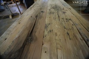 Specifications: 8′ Reclaimed Wood Table – 32″ wide – 3″ Joist Material Base – Satin Polyurethane Finish [no epoxy] – Reclaimed Hemlock Threshing Floor Board Construction – Distressing Maintained – Original barnwood live edges – Bread-edge boards on ends