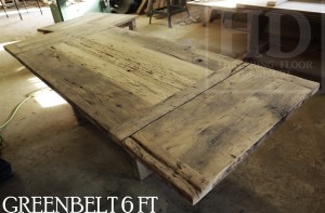 6 ft Reclaimed Wood Table – Modern Plank Style Base – Centre gap on posts – Reclaimed Hemlock Threshing Floor Top – 3″ reclaimed joist material posts – Two 18 inch leaf extensions making total length 9 ft when extended