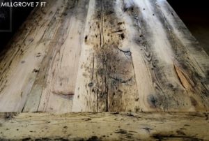 Description: 7 ft Rustic Reclaimed Wood Table – 42″ wide – Reclaimed Hemlock Threshing Floor Construction – Premium epoxy/polyurethane finish – One 18″ Leaf – Distressed Stainless Steel Base – 18″ [matching] Round Lazy Susan – Original Barnwood Edges Maintained
