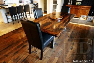 Description: 7 ft Rustic Reclaimed Wood Table – 42″ wide – Reclaimed Hemlock Threshing Floor Construction – Premium epoxy/polyurethane finish – One 18″ Leaf – Distressed Stainless Steel Base – 18″ [matching] Round Lazy Susan – Original Barnwood Edges Maintained