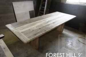 Specifications: 9 ft Reclaimed Wood Table – 42″ wide – 3″ Plank posts base – Premium epoxy/polyurethane finish – Reclaimed Hemlock Threshing Floor Construction – Original barn floor board edges maintained