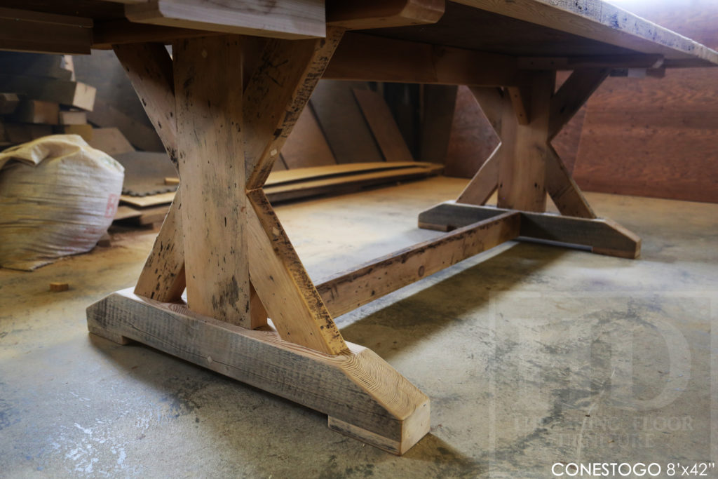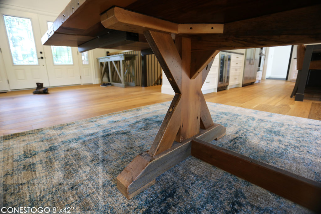 Description: 8 ft Sawbuck Base Table – 42″ wide – Reclaimed Hemlock Threshing Floor Construction – Premium epoxy & matte polyurethane finish – Original edges/distressing maintained – Two 18′ Leaf Extensions [making total length 11 ft when extended] / Copyright HD Threshing Floor Furniture / www.hdthreshing.dreamhosters.com/blog